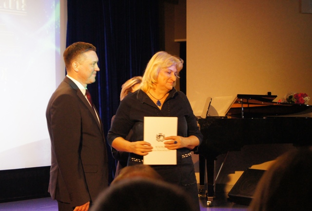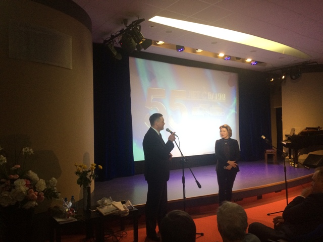 Директор Дома ученых Г. Г.Лозовая принимает поздравления от руководителя Сибирского территориального управления Минобрнауки А. А. Коловича