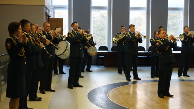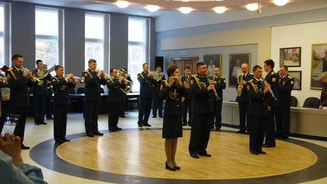 Но это был еще не конец вечера. В фойе Малого зала гостей ждал сюрприз – оркестр Новосибирского военного института войск национальной гвардии РФ им. генерала И. К. Яковлева, во главе которого был художественный руководитель Сапсай Алексей Викторович.