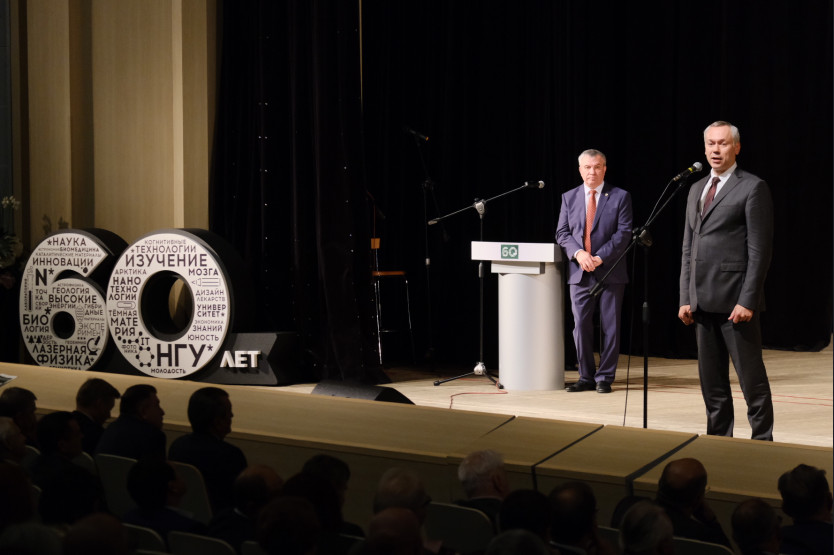 Губернатор Новосибирской области Андрей Травников поздравил преподавателей и студентов НГУ с 60-летием университета и вручил ректору НГУ памятный сувенир — официально заверенную копию Постановления Совета Министров СССР «Об организации НГУ» и Благодарственное письмо Губернатора Новосибирской области коллективу университета. Губернатор отметил, что гордость нашего региона за НГУ сформирована его уникальной историей создания и развития.