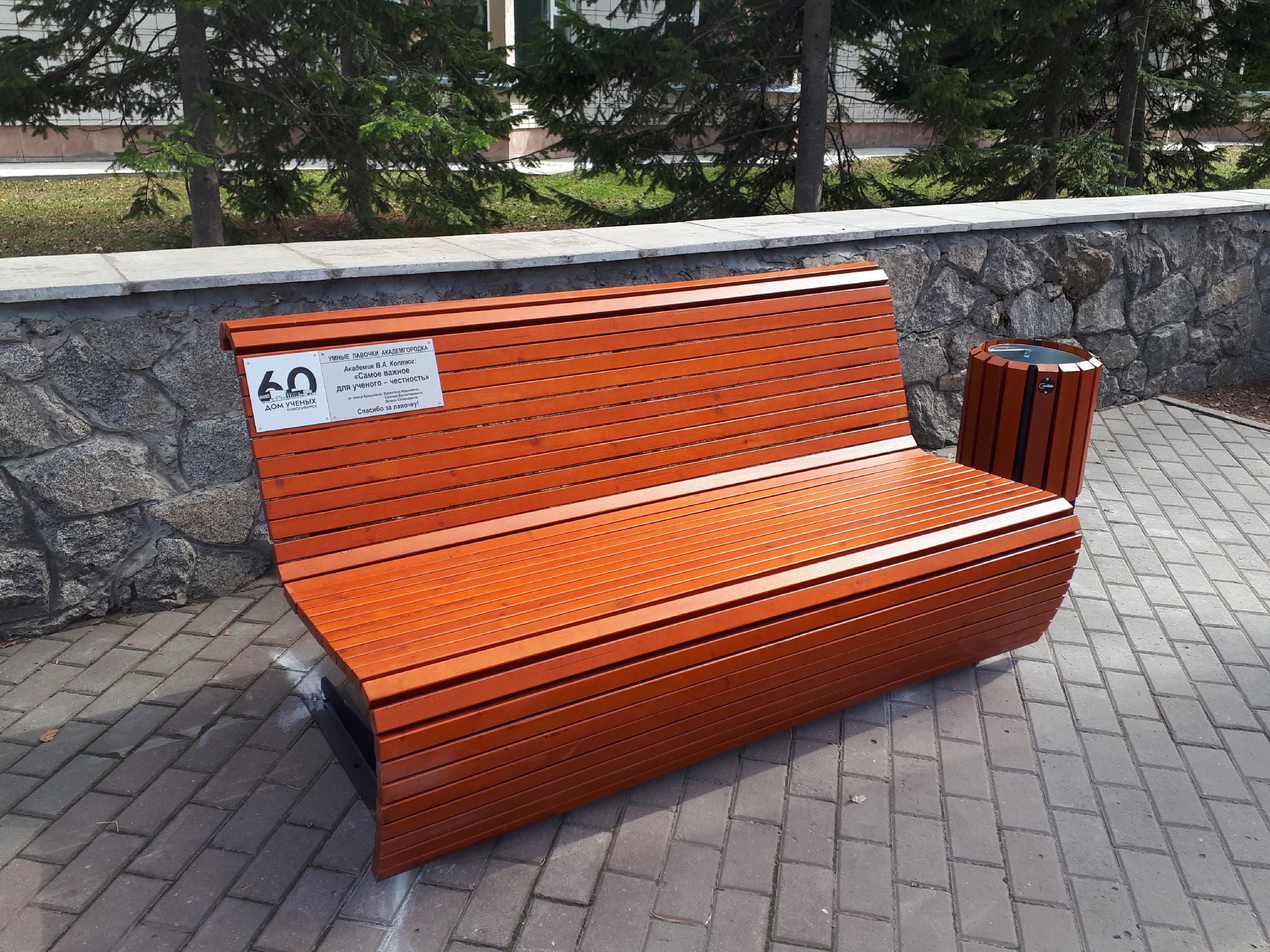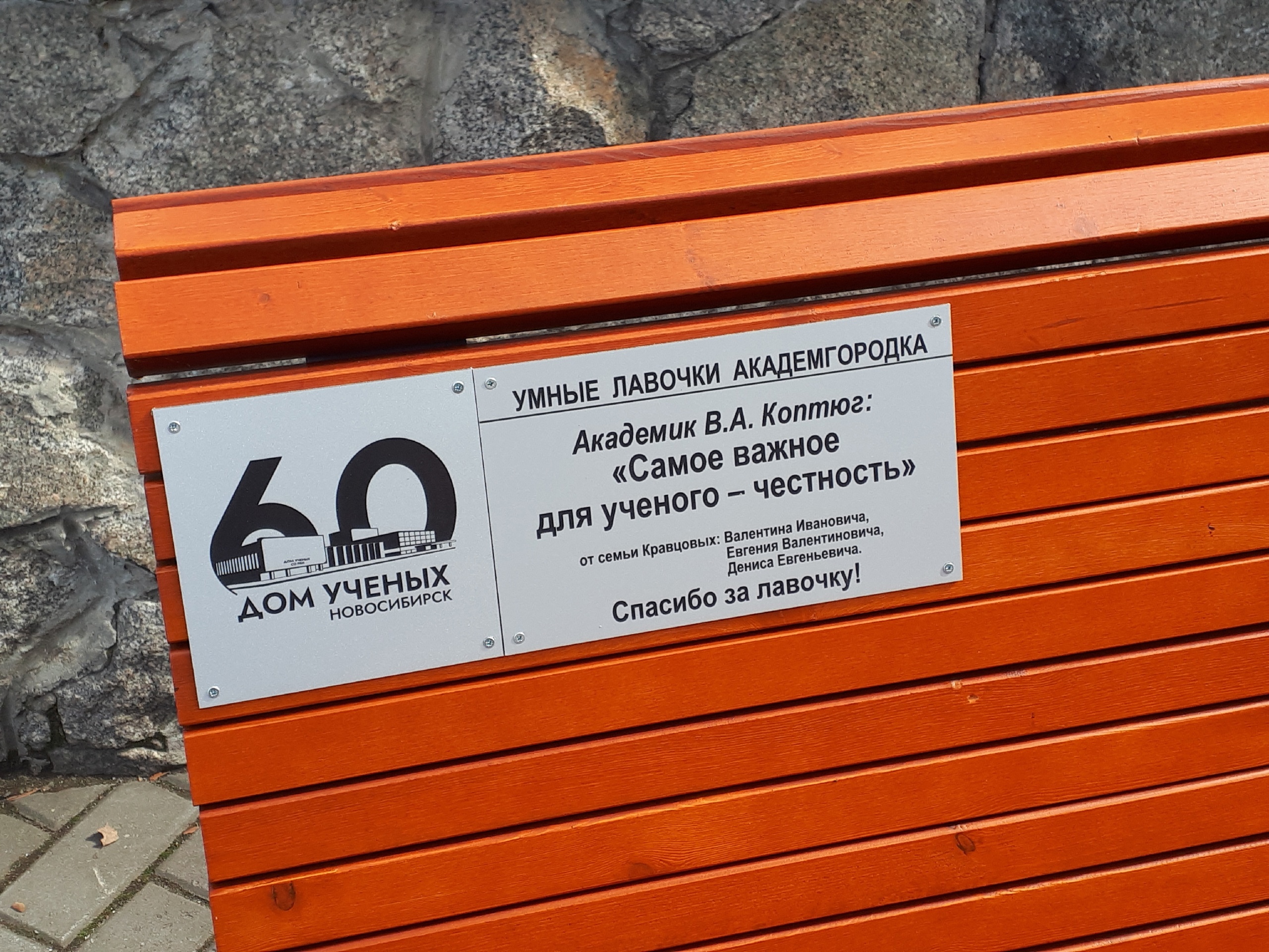 Перед Домом ученых установили новую лавочку из серии «Умные лавочки Академгородка». На ней можно прочитать высказывание академика Валентина Афанасьевича Коптюга: «Самое важное для ученого — честность».