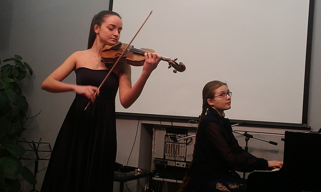 Вот такие артисты выступали 24 ноября. Программа была сверхсерьезная, достойная самых высоких профессионалов, исполнялись: «Каприс» Паганини, Концерт Моцарта, «Испанский танец» де Фалья и как высший пилотаж – «Поэма» Шоссона и «Интродукция и рондо-каприччиозо» Сен-Санса, которые блестяще исполнила студентка 2 курса Нурдана Егешова. Также прекрасно выступили Мария Калинина, которая была еще и ведущей, Мария Кривенко, Надежда Белякова и наш неизменный концертмейстер многих студенческих концертов – пианистка Мария Шаманина.