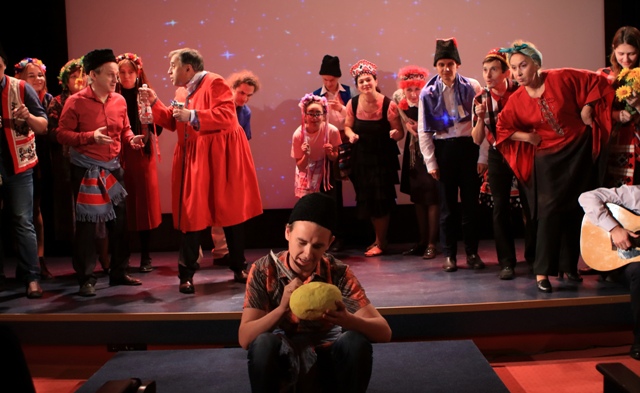 На снимках: сцена из спектакля «Иван Иванович и Иван Никифорович», фрагмент из композиция «Бессмертный полк», поздравление театру от директора Дома ученых.